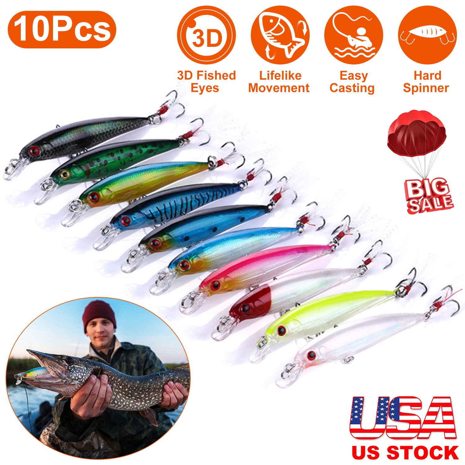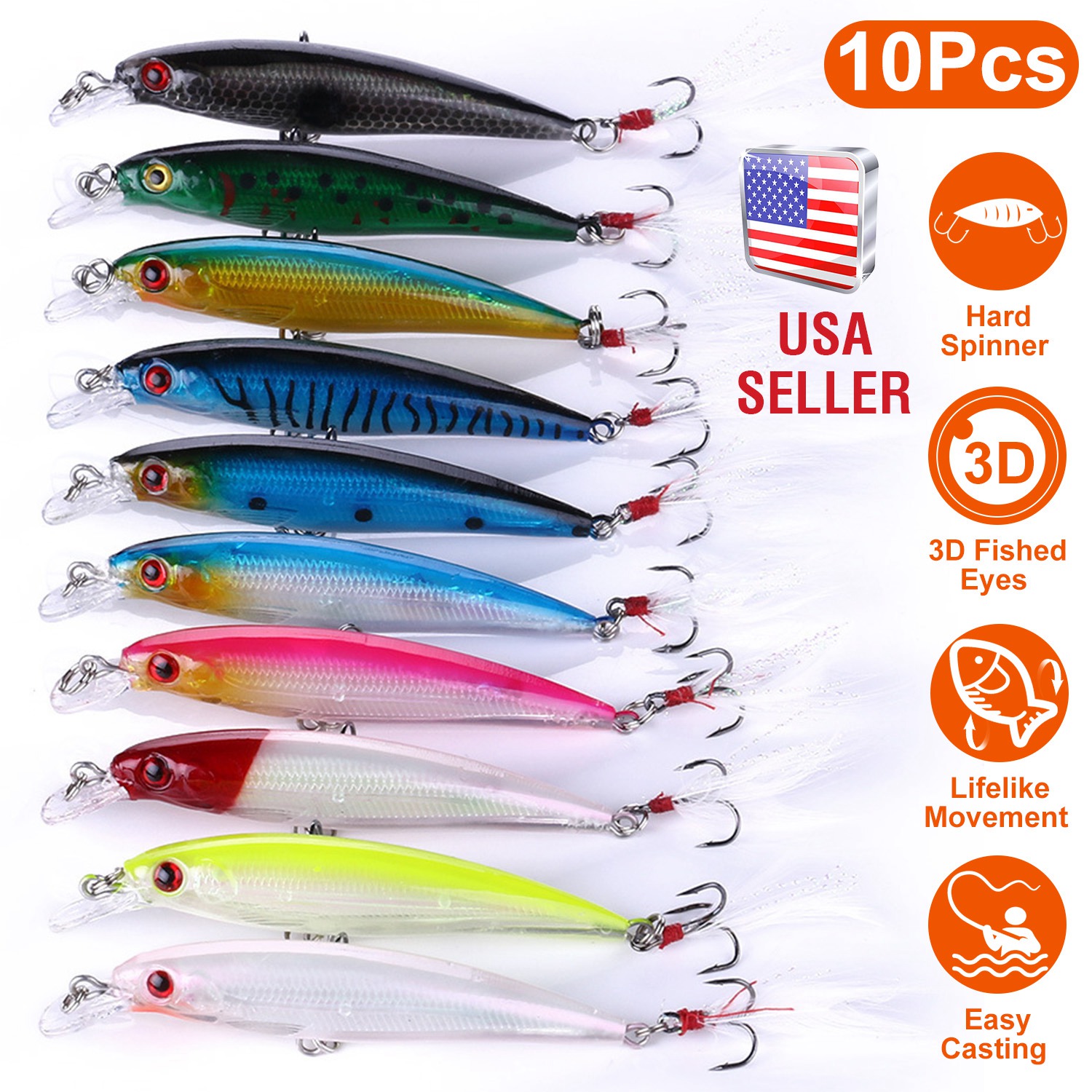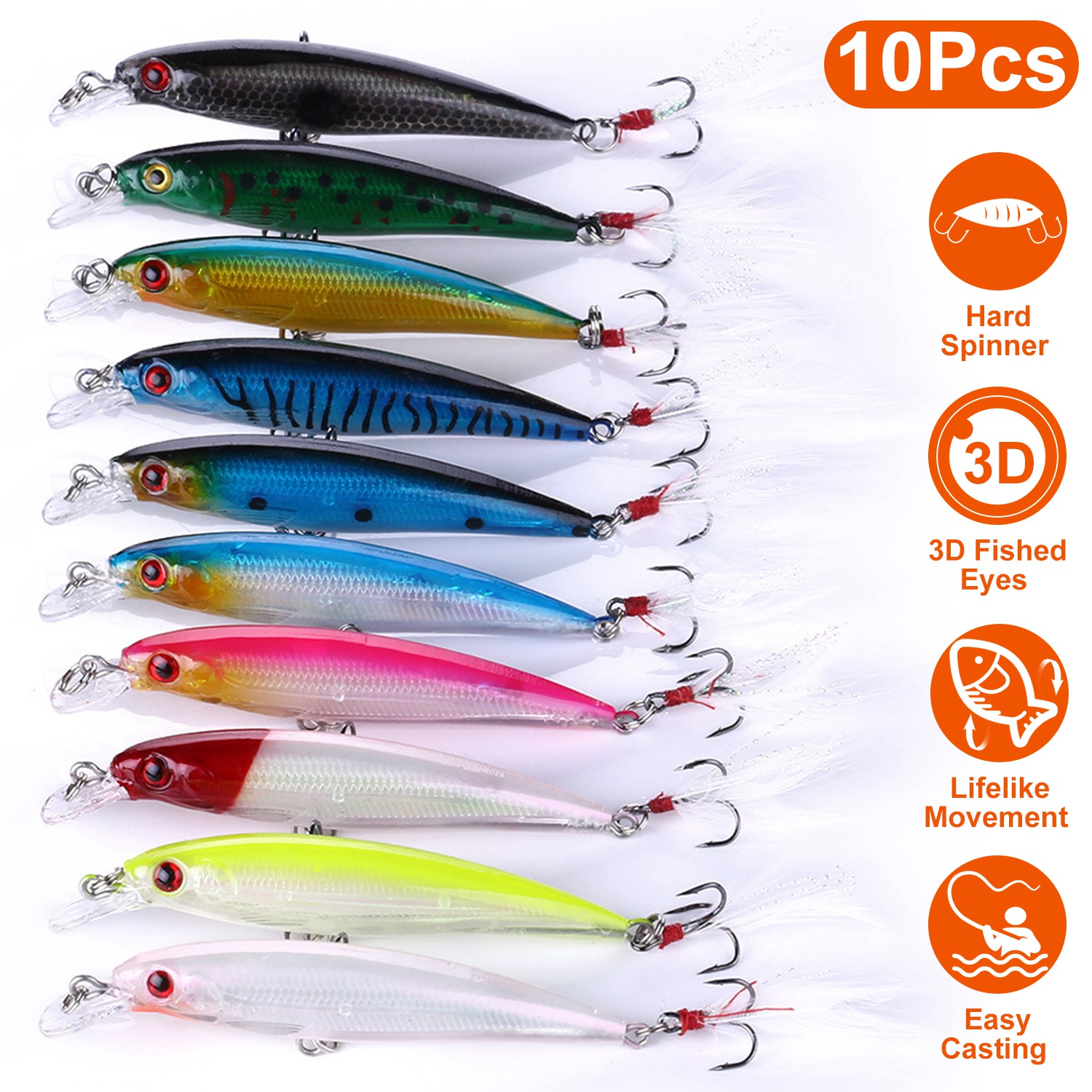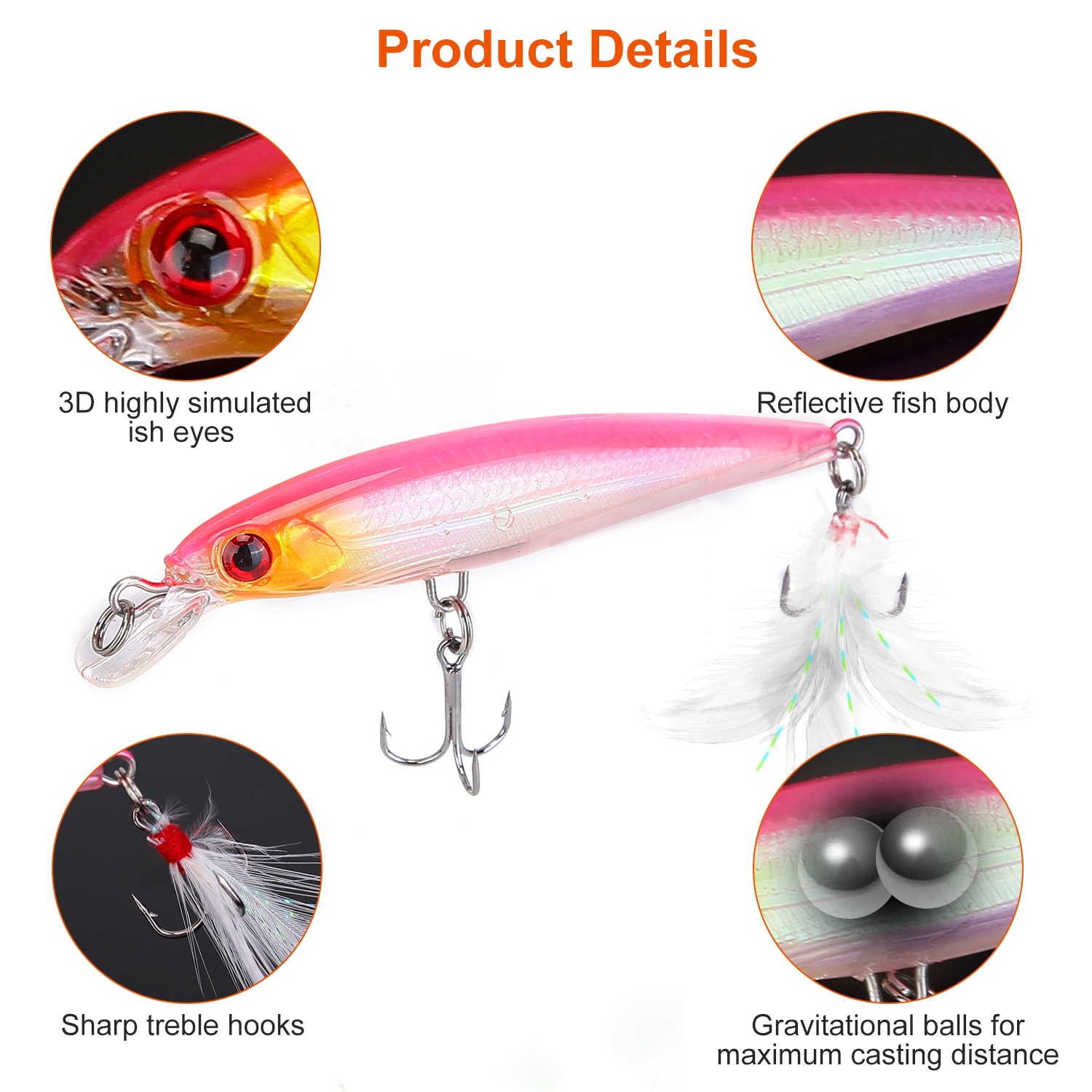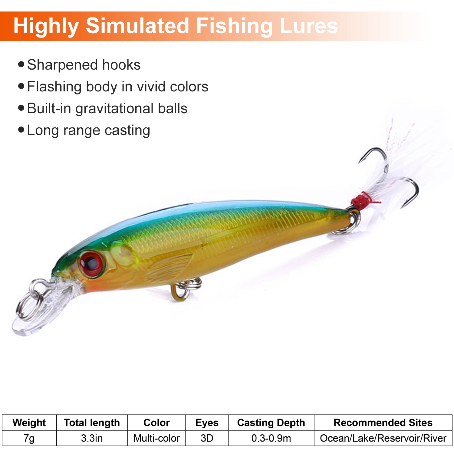 • 3D Simulated Fish Eyes: Each lure features natural fish body with highly simulated eyes, more attractive for large-sized predators.