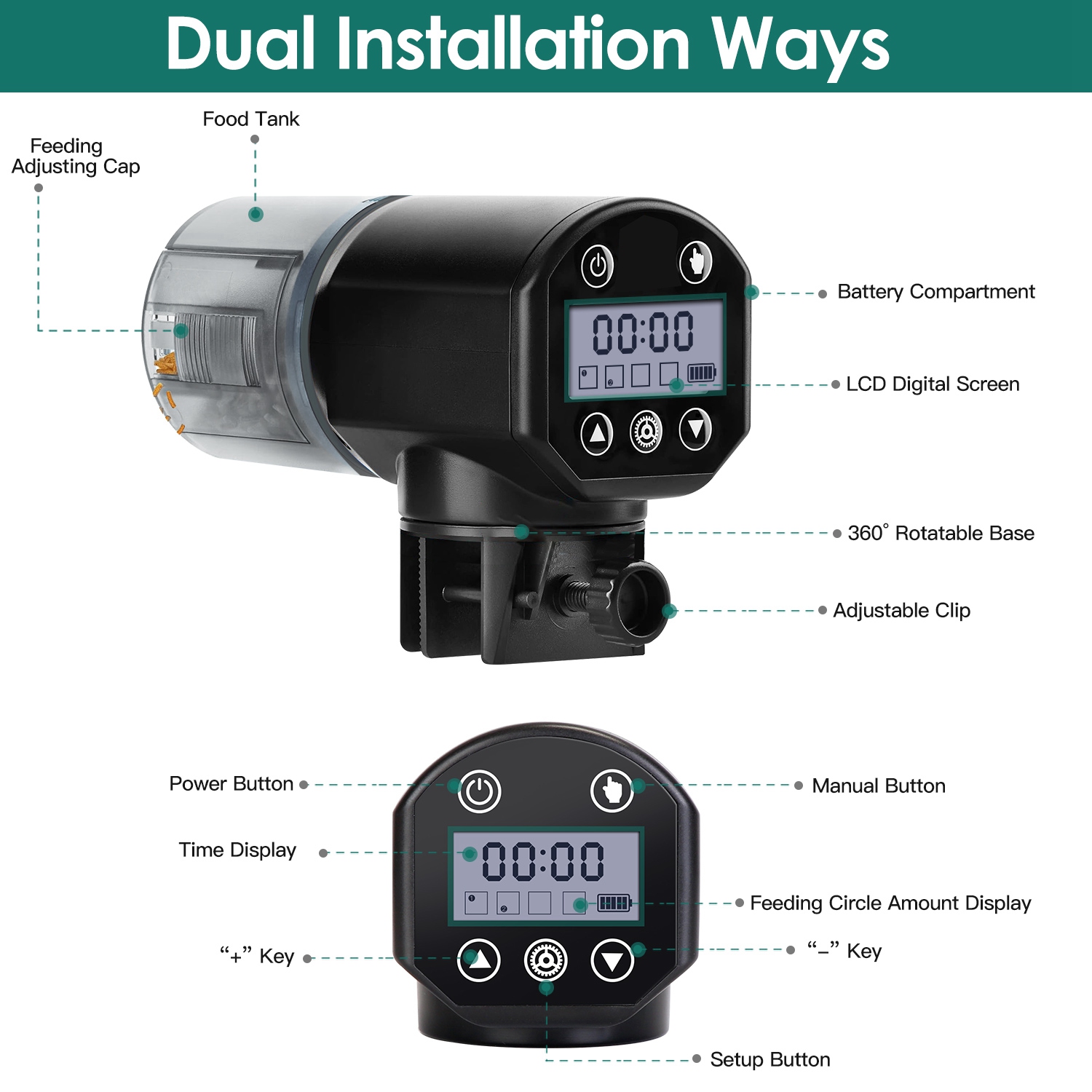 • Moisture-proof Material: Adopt LCD digital screen, clearly displaying the battery remaining capacity and setting numbers, so that you can change the batteries in time. Made of premium thickened plastic with moisture-proof design, ensure the freshness and dryness of fish food. A practical and affordable assistant to meet your various feeding demands.