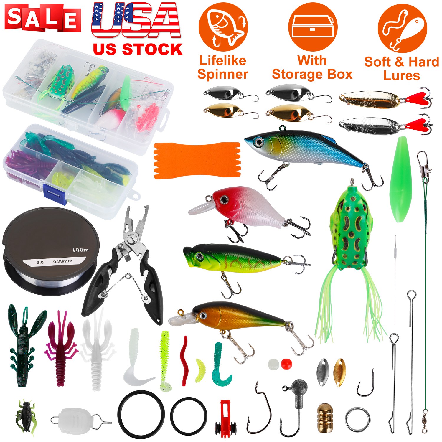 • Portable Tackle Boxes: All the fishing lures can be stored in two tackle boxes, one for soft lures, and the other for hard ones. Bring much convenience when transport and storage.